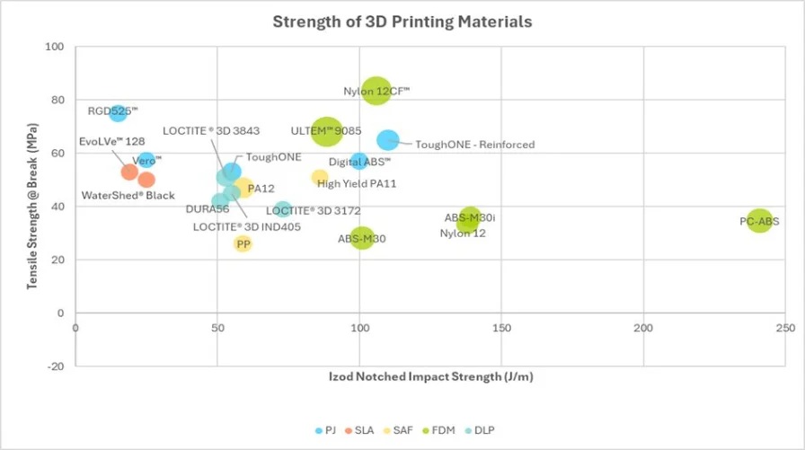 Grafikon koji Stratasys nudi prikazuje samo mali uzorak materijala, s naglaskom na vlačnu čvrstoću, udarnu čvrstoću i temperaturu savijanja pod opterećenjem (HDT). No, postoje i druge važne karakteristike koje utječu na izbor.